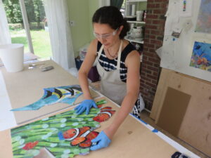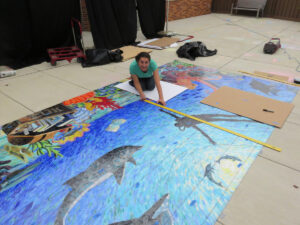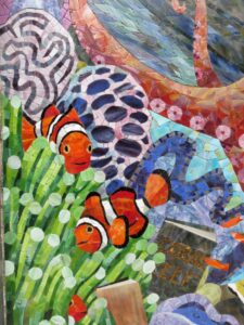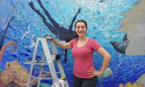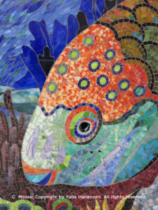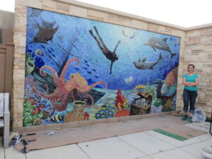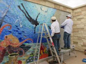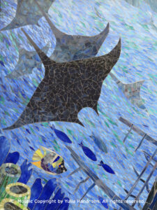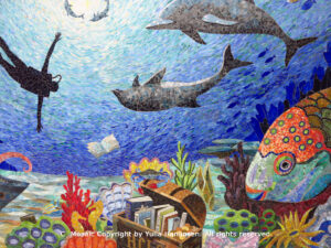 A diver is exploring an underwater world and in a process discovers a treasure chest full of books and maps. This playful, unique design was made for a part of library facing kids and teenage reader section. It is a part of an underwater theme featured throughout the building. Mosaic was constructed at the studio and transported in 66 separate sections to the site. It was further assembled on site and installed by a team of experts.